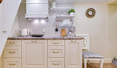 Кухня оснащена всеми удобствами для приготовления блюд: есть чайник, индукционная плитка, вытяжка и холодильник. Здесь же вы найдете необходимую посуду, столовые приборы, а также бесплатные чай, кофе, сахар, соль и специи.