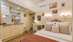 Вы можете выбрать одноуровневый или двухуровневый номер – в последнем на втором этаже располагается дополнительное спальное место, поэтому такие студии идеально подходят для семьи или компании до 3 человек.