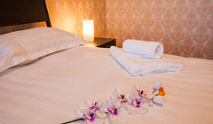Искали номер для троих (мы с ребенком),было отмечено,что втроёми что ребенку 5 лет,а по факту одна большая кровать (ну это хоть было известно), но почему-то подушки только две, полотенец тоже только два комплекта (когда попросили ещё, нас отказали) - ладно ещё спать втроём на одной кровати с ребёнком,но на двух подушках - это как? У нас ж не грудничок. Расположение отеля само по себе не плохое, рядом даже озеро с пляжем, но это на отшибе города (нам с машиной было нормально), а кроме того: очень не примерный вход рядом с магазином- не вселяет доверия,заселялись с опаской,но в общем все прошло нормально. Ещё напрягало,что на завтраке работницы отеля между собой говорили на своём (не русском) языке - кухня маленькая совсем,чувствуешь себя неуютно,вроде ж в своей стране...