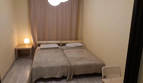 В номере есть всё необходимое, микроволновка, мини-холодильник, чайник, двуспальная кровать и односпальная кровать. Полочки/шкаф с вешалками. Своя ванная и туалет. Гладильная доска, утюг, фен. В день заселения приятно удивили вкусняшками (шоколадки, чай, вода питьевая).