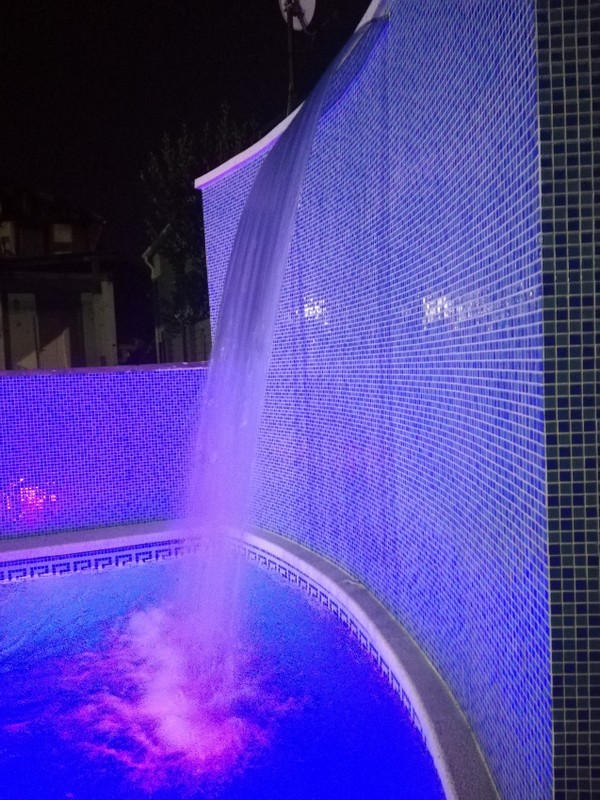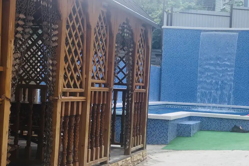 На территории имеется оздоровительный бассейн (9 * 4,5) с подогревом, со струйным гидромассажем, донным гейзером и водопадом.