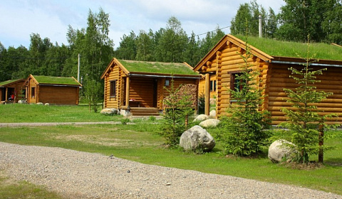 6 гостевых бревенчатых домиков с травяной крышей. Проживание в палатках в кемпинге на живописной поляне на территории базы. В пользовании душ, туалет, эллинг для хранения лодок и снаряжения, очаги для приготовления пищи. Кемпинг.