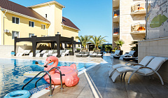 Отель расположен на берегу речки. Если брать номера, то с видом «на реку». В пешей доступности два пляжа и тусовочный место «Мандарин» Это одна из главных достопримечательностей отеля-вкусная еда. Завтрак отличный. Любое блюдо в меню - шедевр. И очень отзывчивые официанты Номер и весь отель сделаны очень качественно. Вся мебель и сантехника качественные. Находится в номере приятно. Единственный нюанс, лично мне хотелось бы номер (даже стандарт) по-больше. Было тесновато. В остальном, мебель, отделочные материалы, все на высоком уровне. Это отдельный пункт, за который хочется поблагодарить. Уборка каждый день. И каждый день заходишь в чистый свежий номер. Каждый день новые бутылки воды, не зависимо использованы старые или нет. Каждый день новый гигиенический набор. За поддержание состояния номера высшая оценка. Персонал отеля очень вежливый, отзывчивый. 9 баллов только за то, что отдавал одежду в стирку. На следующий день не вернули. Пришлось выяснять почему. Оказывается, произошло ЧП в прачке. Какое, не говорят. Попросили убедиться, что с одеждой все в порядке. С ней правда все было в порядке) В остальном, персоналу большая благодарность за отзывчивость. В отеле приятно находиться.
