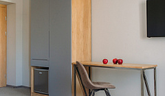Вообще с физикой у того, кто проектировал номер очень плохо. В санузле на уровне головы висит теплофон, а сверху до потолка еще 2м, поэтому в санузле, который одной стеной сообщается с улицей, просто адский холод, холоднее, чем в самом номере. Хотите помыться - врубите сначала горячий душ и только потом раздевайтесь.