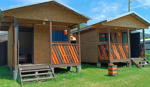 Для проживания предоставляем 3-хместные гостевые домики. Имеются домики без удобств (теплый душ и туалет на территории), а также благоустроенный домик (санузел у домике)