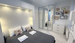 Апартаменты в историческом районе внутри ТТК в ЖК бизнес класса оборудованы удобной двуспальной кроватью, двуспальным диваном, блэкаут шторами, чистым постельным бельем, тапочками, полотенцами, посудой на 6 персон, средствами личной гигиены, Wi-Fi и телевидением с заботой о Вашем комфорте.