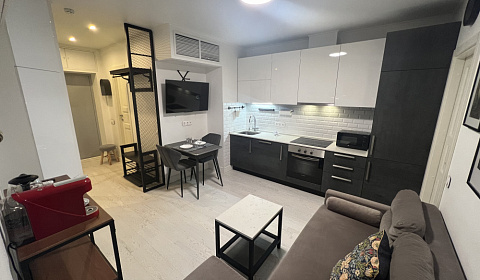 Квартира укомплектована кондиционером, посудомоечной машиной, телевизором, стиральной машиной с сушкой, вентиляцией, свежими фильтрами для воды, индукционной варочной панелью, духовом шкафом, кофемашиной, микроволновкой, феном и чайником.