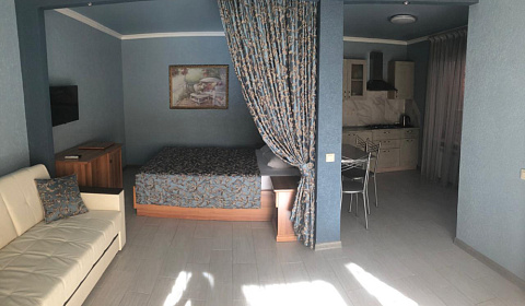 Наш Домик-студия подходит для уютного семейного отдыха для семьи из 4-х человек. Рядом с Домиком расположен центрпльный сосновый бор-парк, в котором можно прогуляться и насладиться ароматным хвойным воздухом, а так же послушать пение лесных птиц. В Домике есть телевизор, холодильник, сплит-система. Имеется собственная кухня со всей необходимой посудой для приготовления пищи и все необходимые столовые приборы. Ванная комната. В ванной комнате есть душ, туалет, фен, туалетные принадлежности. Wi-Fi.