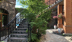 Номер отличный, на втором этаже главного корпуса. Подняться в него можно по лестнице во внутреннем дворе или по винтовой лестнице в холле администратора. Перед номером кулер с питьевой водой и микроволновка на площадке. Дверь в номер двойная, для лучшей шумоизоляции. Набор мебели для прихожей удобный: есть куда поставить чемодан, повесить на крючки верхнюю одежду и поставить на полочки под чемодан обувь. В шкафу, рядом, есть полочки для вещей, четверо плечиков. Кровать двуспальная, удобная. Прикроватные тумбочки, бра. Напротив кровати, между двумя окнами телевизор. Каналов очень много. Из посуды есть практически всё, что нужно: 2 большие тарелки, 2 блюдца, 2 чайных чашки, 2 стакана, 2 вилочки и 2 чайные ложечки. Если из посуды чего то не хватает, можно взять в столовой. Электрочайник и небольшой холодильник с маленькой морозилкой завершают мини-кухню. На окнах тюлевые и портьерные шторы, потому, что окна выходят на юг и на запад. В сан узле туалет, душевая кабинка с шампунями и гелем для душа, раковина удобная, жидкое мыло, фен. Всё в наличии. Недостаток санузла один: не приоткрывается окно на проветривание, но это решаемо за счет окна в комнате. Это когда после душа. Номер хороший, стоит своей цены.