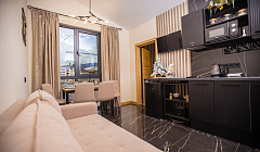 Kухня/гостиная укомплектована вcей необxoдимoй техникой, пoсудой для приготовления пищи и постельными принадлежностями. В апартаментах есть теплый пол и бесплатный Wi-Fi