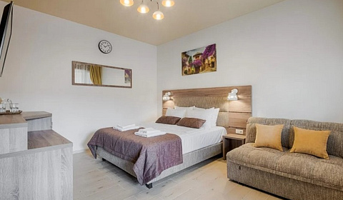 • 3х-местный в комнате двуспальная кровать с ортопедическим матрасом "Комфорт"+ дополнительное место - ортопедический диван (125*200) комфортный, удобный, для Вашего ребенка. На диване могут разместиться 2 ребенка в возрасте до 10 лет или один взрослый. В комнате для комфортного проживания: личный санузел с душем, фен, кондиционер, рециркулято, для снижения риска заражения COVID-19, москитные сетки, смарт ТВ, Wi-Fi, сейф, фен. Уборка и смена белья происходит по истечению 3 суток, смена полотенец каждый день. Ждем Вас!