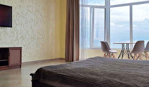площадь апартамента 50 кв.м., состоит из двух изолированных комнат: большая (31 кв.м.) и маленькая (9 кв.м.), совмещенный санузел (туалет и душ) площадью 3 кв.м., кухни 7 кв.м. Имеется открытый балкон с видом на море. Вход в апартамент 3 этажа через открытую лестницу, оборудованную террасой.