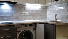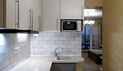 В кухне установлено: индукционная варочная поверхность, микроволновая печь, двухкамерный холодильник, электрический чайник, стиральная машина, комплект посуды и столовых приборов для приготовления и употребления пищи.