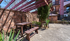 Территория небольшая, уютная. Есть столы по навесами, кухня.