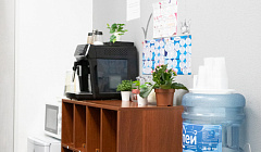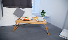 Есть питьевая вода, чайник. Можно заказать завтраки, но заранее.