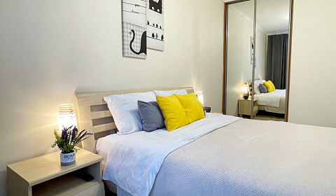 В апартаментах две комнаты. Одна спальная комната с большой двуспальной кроватью, гостиная комната с телевизором с плоским экраном, два раскладных дивана. На кухне оборудовано все необходимое для проживания, имеется микроволновая печь, холодильник, кофеварка, чайник. Наличие стиральной машинки. В ванной комнате для пользования гостями имеются полотенца, фен. Постельное белье входит в стоимость проживания. Для наших гостей предоставляется бесплатный безлимитный Wi-Fi. Бонус для наших гостей - кофе, чай, сахар, соль, гигиенические принадлежности (мыло, щампунь и кондиционер д/волос, гель д/душа), одноразовые тапочки! В наш апартамент предусмотрено дистанционное круглосуточное заселение!