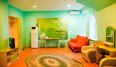 Администратор вежливая и готовая помочь. Номер большой, мебели достаточно. Микроволновка. В коридоре кулер с водой, большой сервант с самой разнообразной посудой. Чай, растворимый кофе, сахар - бесплатно.