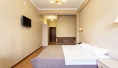 Отдыхала с двумя детьми 18 и 4 лет. Большой номер-студия с кроватью king-size, и кухней. Удобный матрас, чистая постель хорошего качества,раскладной диван отличный. В номере имеется вся посуда.