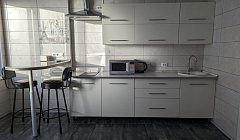 Кухня: электрическая плита, СВЧ печь, холодильник, чайник, фильтр для воды, набор посуды.