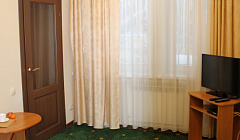 Нет штор на окнах. Номер сырой и холодный, его бы проветрить, но окно не открывается.